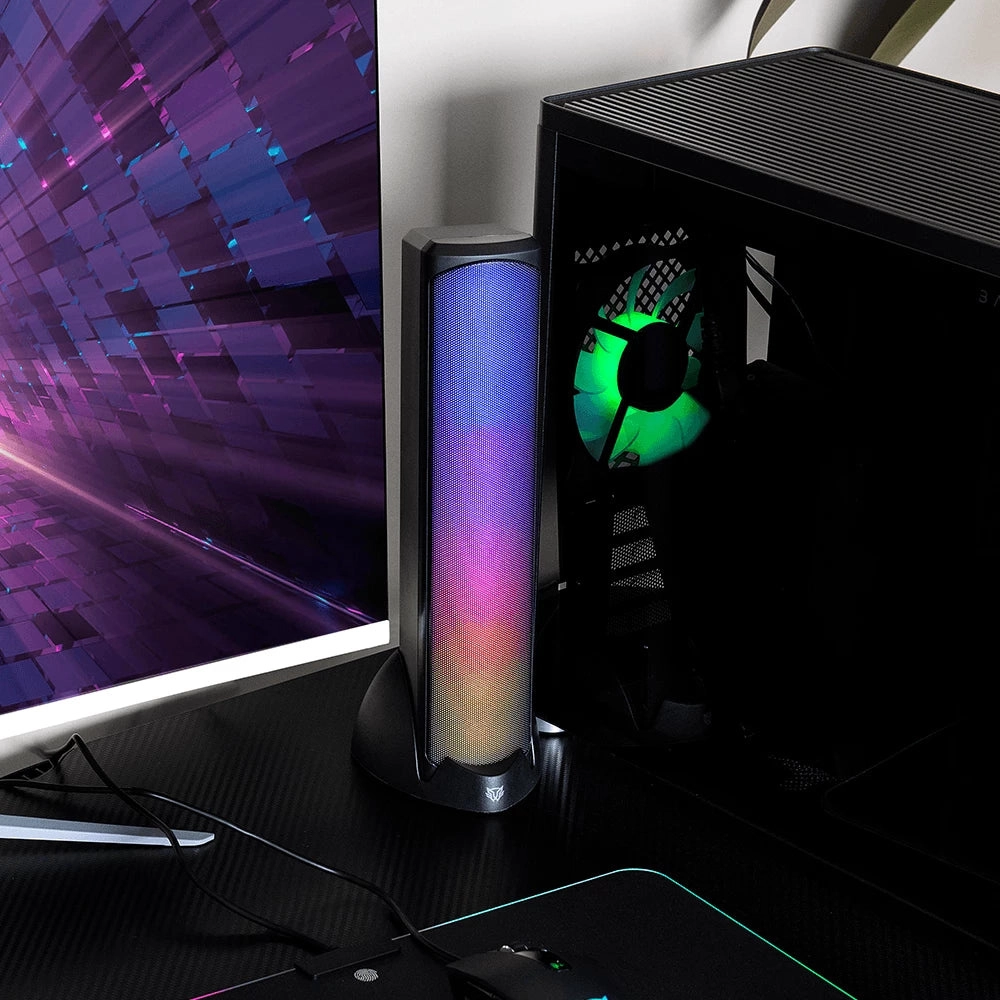 Bocinas 2.0 gamer glimm tower bg575 balam rush conexión bluetooth/auxiliar - iluminación led 3 modos, 10w rms. sonido estéreo, alimentación 5 vcc 1a, tipo d