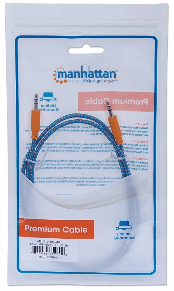 Cable audio,manhattan,352802, estereo 3.5mm m-m 1.0m textil azul/naranja