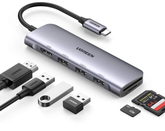 Docking station ugreen, 6 puertos, interfaz usb-c, 3x usb-a, 1x hdmi, 1x microsd, 1x sd, 5000 mbits, plata