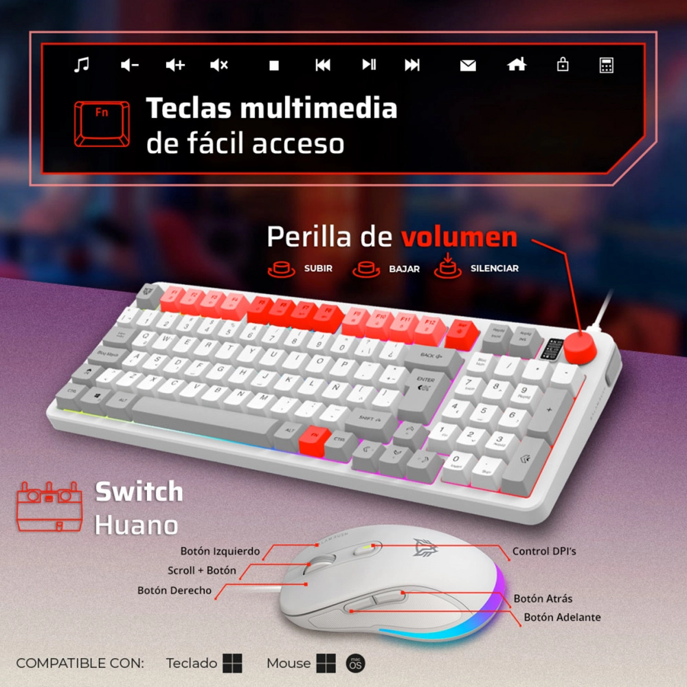Kit acteck combo squad conquest kg515 / teclado y mouse / alambrico / receptor usb / 97 teclas / optico / 7200 dpi / blanco / ac-940450