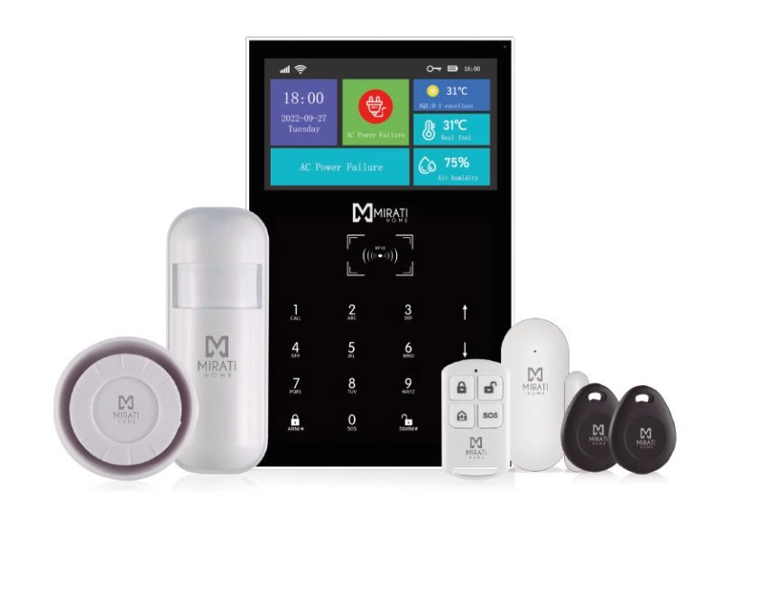 Kit de alarma integral smarthome mirati wifi 4g panel tactil pantalla a color tamper switch incluye sirena, sensor de movimiento, sensor de puerta-ventana, 1 control, 2 tag rfid