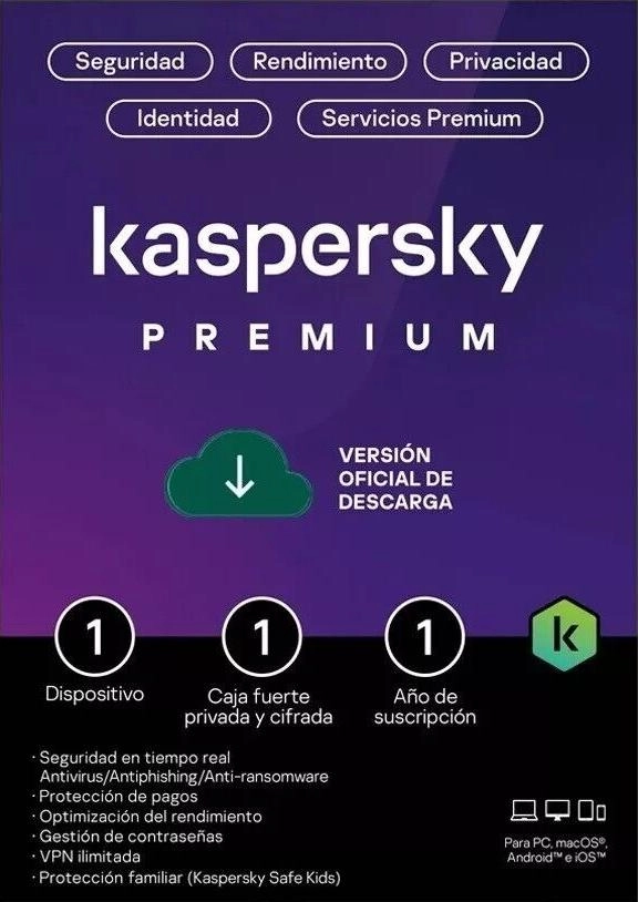 Licencia electronica esd kaspersky premium 1 dispositivo 1 ano base, clave de activacion, no devolucion, no cancelacion