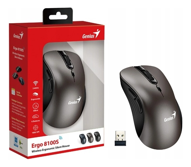 Mouse optico inalambrico genius ergo 8100s, 2.4 ghz, ergonomico, 6 botones, 1600 dpi, titanio color champan