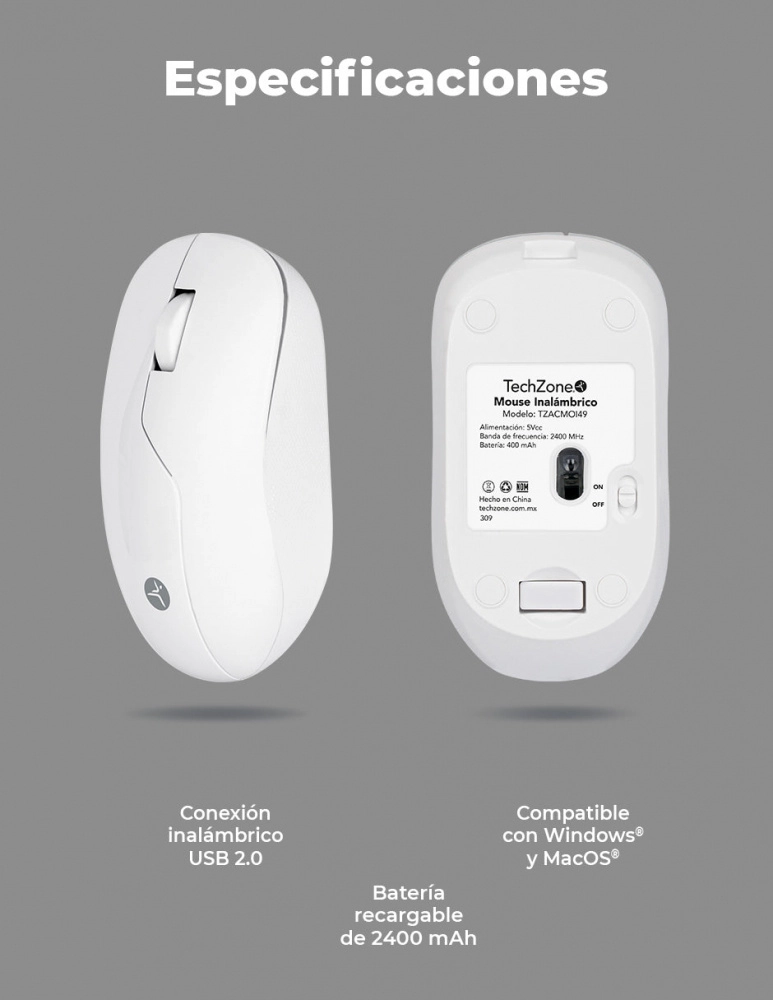 Mouse techzone tzacmoi49 recargable inalambrico alta presicion 1200 dpi 2.4 ghz blanco