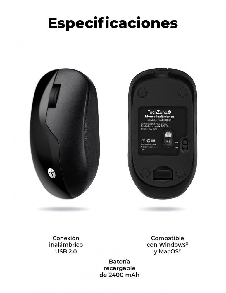 Mouse techzone tzacmoi50 recargable inalambrico alta presicion 1200 dpi 2.4 ghz negro