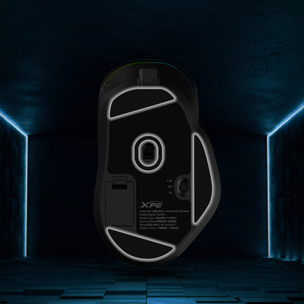 Mouse xpg alpha wireless switch omron pixart paw 3335 16000 dpi 400 ips rgb 6 botones usb tipo c bluetooth inalambrico 2.4g negro gamer (alphawl-bkcww)