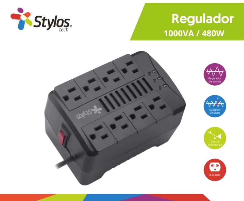 Regulador de voltaje stylos (stre480b) 480w, 8 contactos