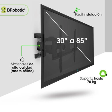 Excelente compra: Soporte para tv - de pared articulado de 30 a 85 pulgadas, doble brazo, de acero, resistencia 70kg, negro, brobotix. Se nota la calidad y rinde perfecto. Después de semanas, sigue como nuevo. El color y la presentación están excelentes.