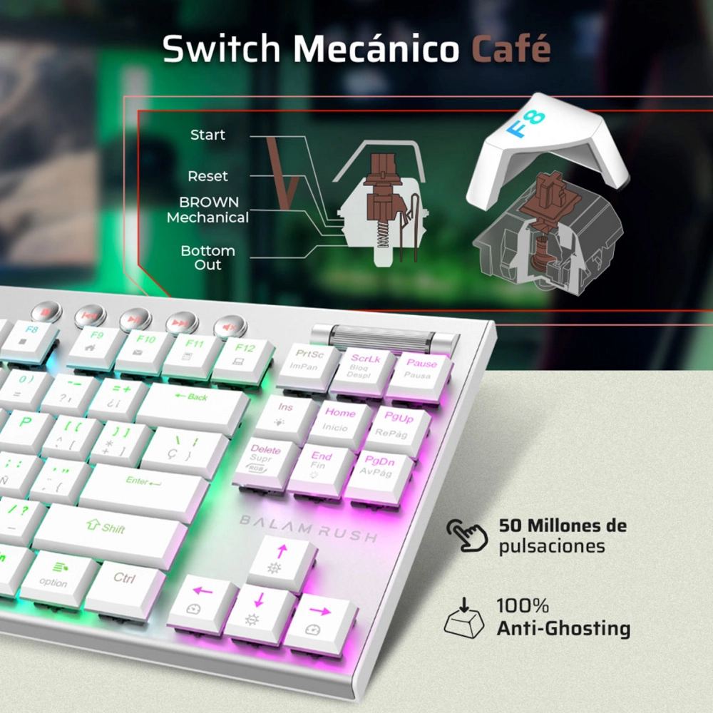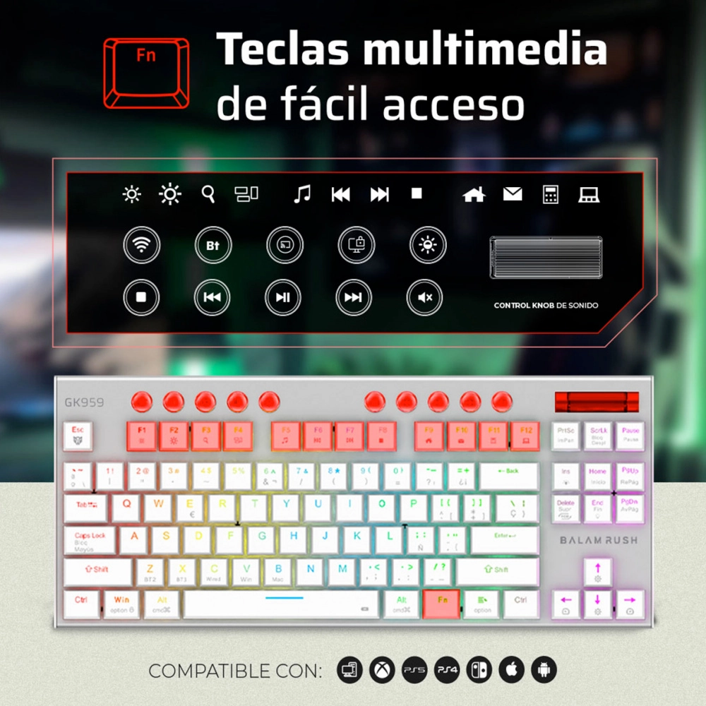 Teclado gamer dominate expert gk959 / inalambrico dual / mecanico / ilumnacion rgb / recargable / 87 teclas / win - mac - android - consolas de juego / español / dongle-bt 5.0 / blanco / br-940412