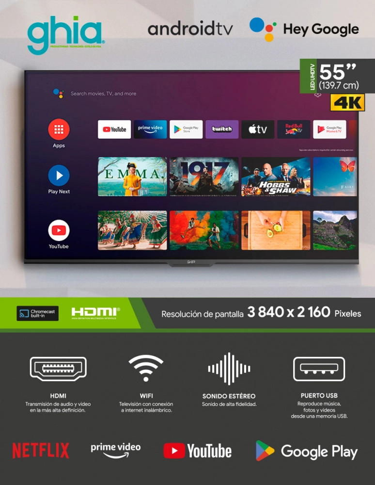 Television smart ghia android tv certified 55 pulg 4k wifi/ rj45 /3 hdmi /2 usb / rca / aux 3.5mm/ optico 60hz