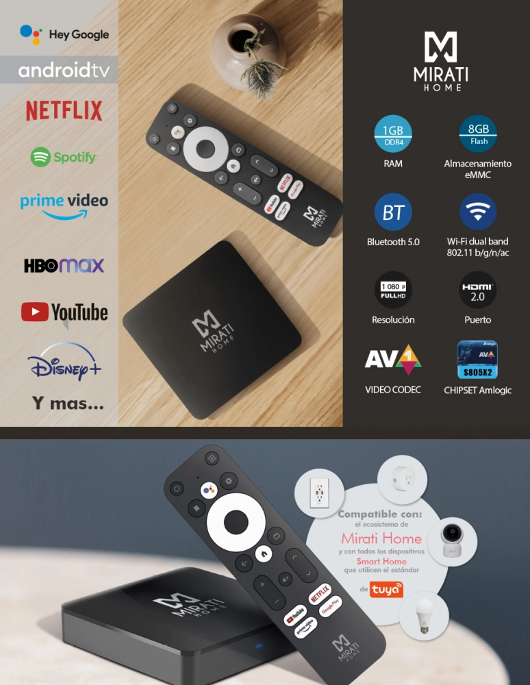 Buena compra. Tv box mirati android tv 1o certificado con chromecast built in y google asisstant / 1gb ram / 8gb almacenamiento/ full hd/ hdmi/ usb /micro sd/ wifi/ bt 4.2 / rj45 rinde bien en el día a día. La entrega fue oportuna. Podría traer mejores instrucciones, pero se entiende.