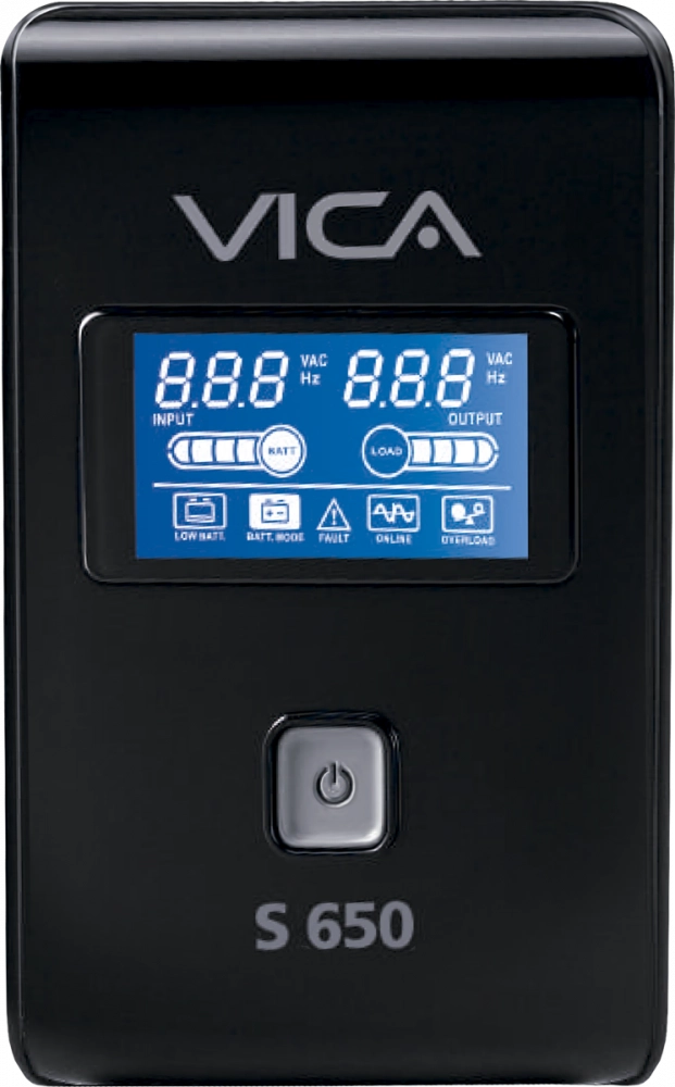 Vica s650, no-break con regulador integrado, capacidad de 650 va 360 w, equipo de tamaño compacto, formato torre, con pantalla lcd, color negro, certificado nom, 8 tomas (4 tomas reguladas 4 tomas reguladas y respaldadas), 3 años de garantía en partes y 2 en baterías. tiempo estimado de respaldo 10-15 min a media carga, 3-5 min a carga completa. *el tiempo de respaldo depende de la carga que conectamos al equipo. *uso recomendado al 80% de su capacidad.